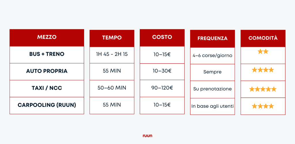 Costo contenuto, paragonabile al bus ma con tempi da auto privata